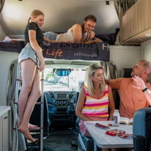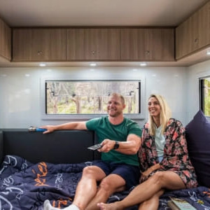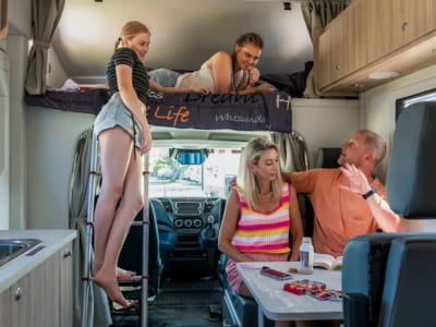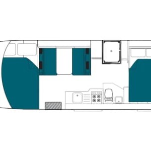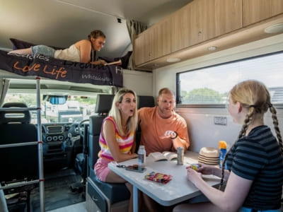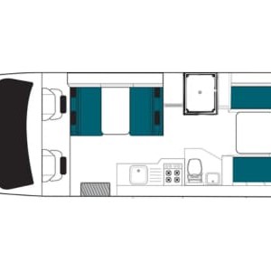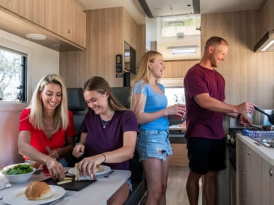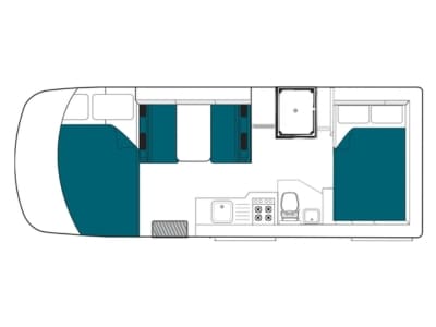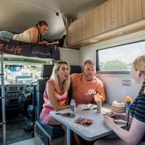 Our focus for this 4 berth motorhome was a contemporary design with an apartment feel – warm neutral tones, wooden floors, genuine leather couches and reading spotlights. We’ve enhanced the front dining zone by pairing the swivel seats with the table behind for a really versatile space for your campervan hire.