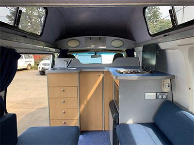 The HiTop Trail Finder is one of our most popular vehicles – and it’s easy to see why. Creative design and clever use of space means 2 – 3 people can travel and live in total comfort. The driving cabin has seating for three with a radio/cassette. The extra vertical space in the living area creates an airy, spacious feeling and ease of movement – and a good-sized double bed and roomy single make for comfortable sleeping.